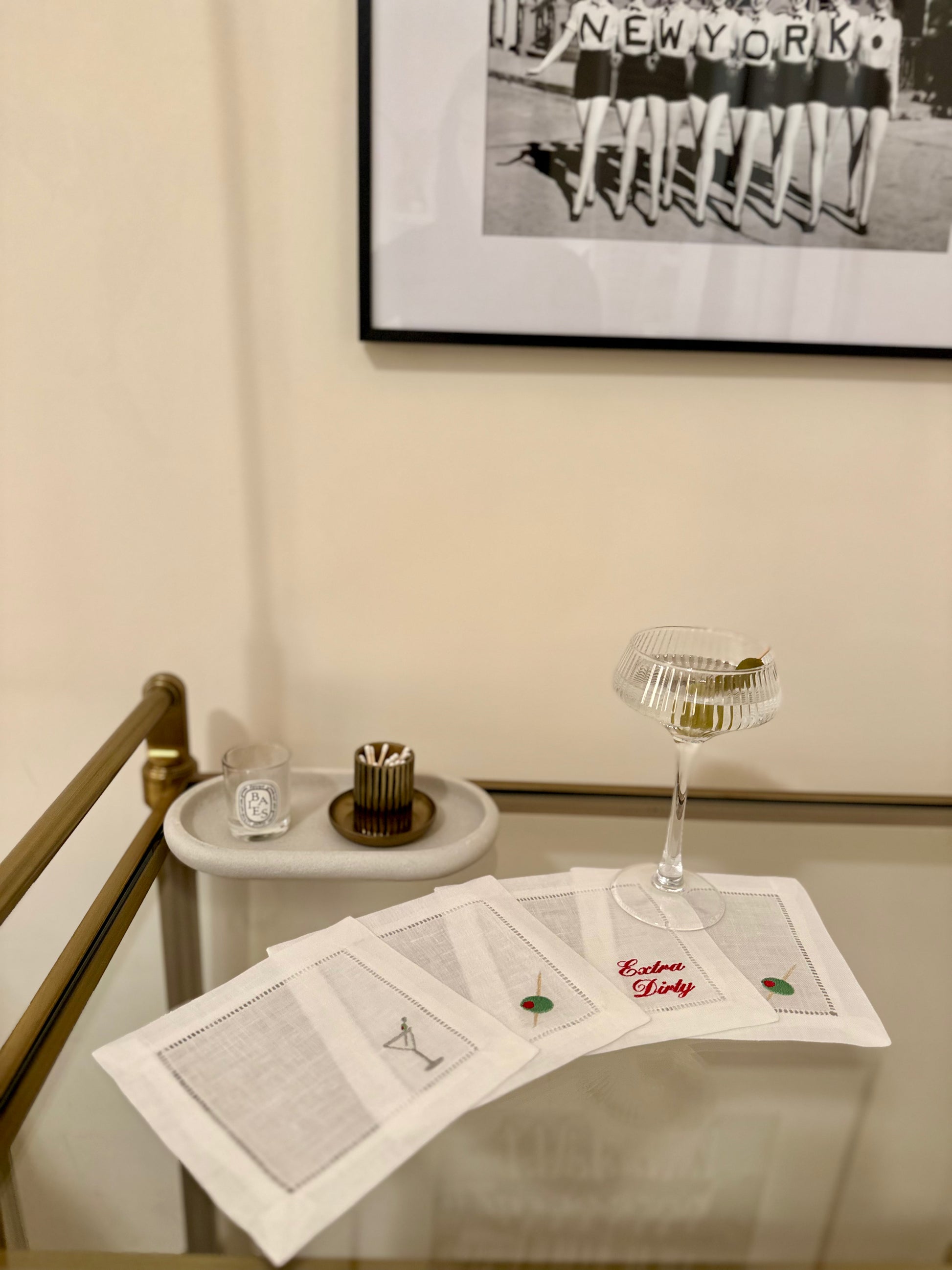 Extra dirty, extra olives! Perfect for fans of this classic cocktail, each napkin features playful embroidery that captures the essence of a dirty martini, complete with olives and a dainty martini glass.
